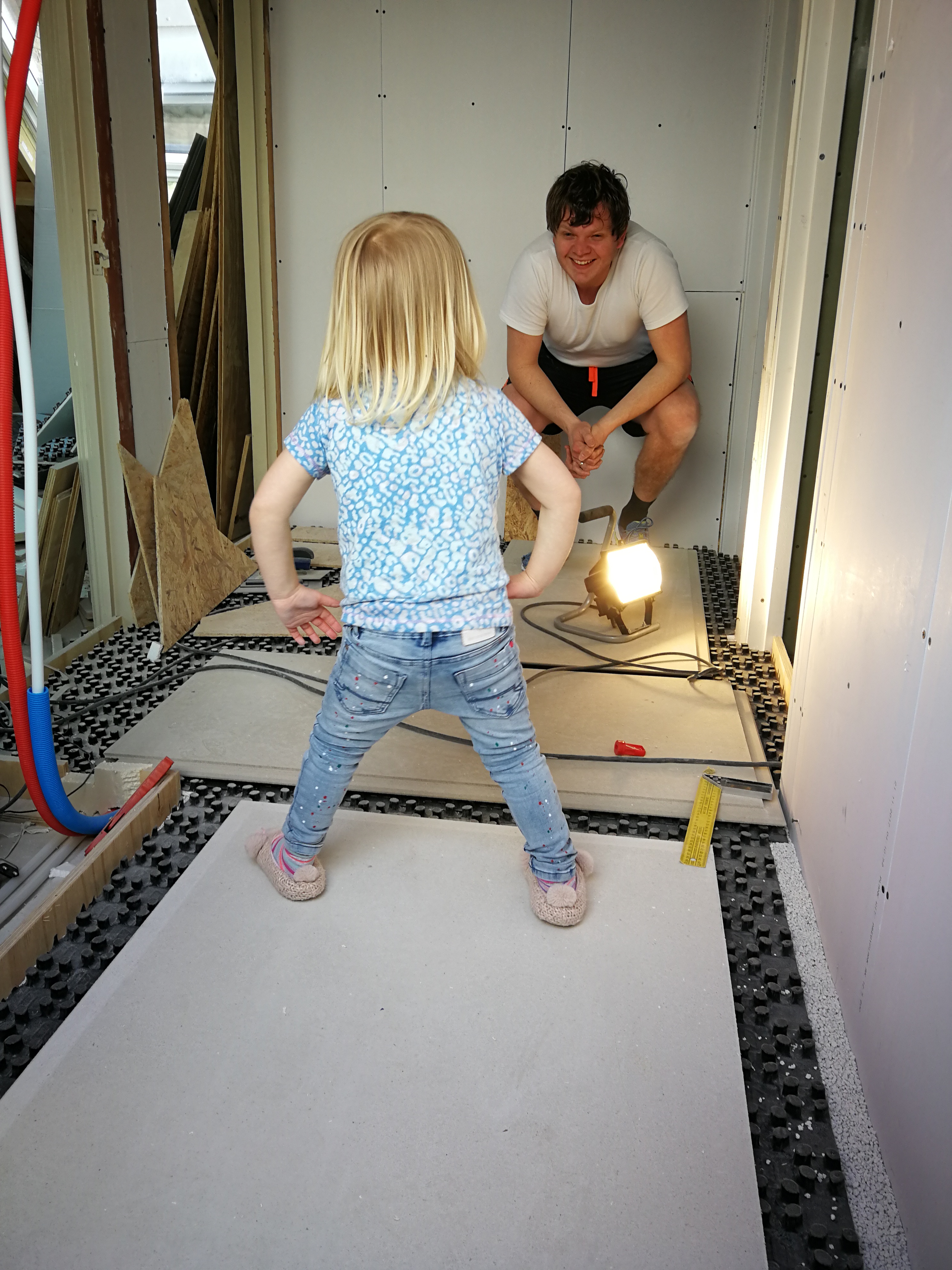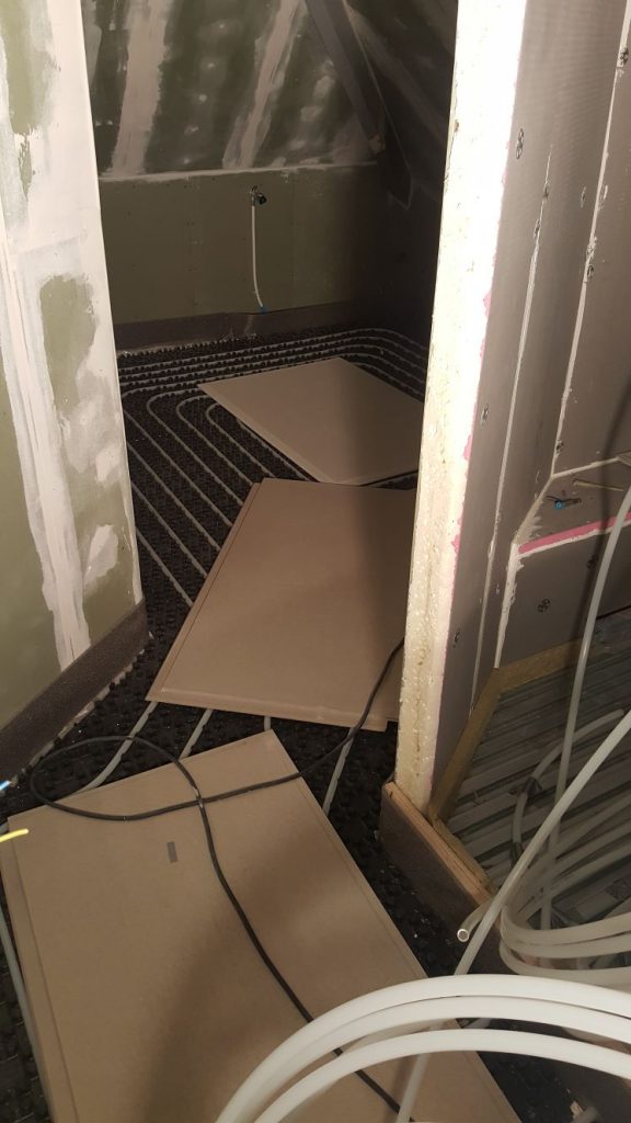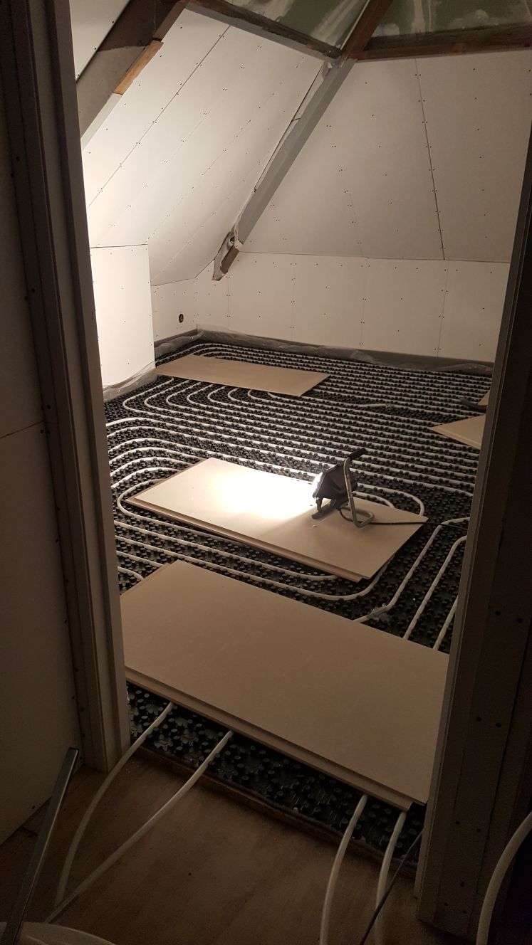 En als de vloerverwarming erin ligt, kunnen de gipsvloerplaten erin. Waterpas!! Wat een verademing!