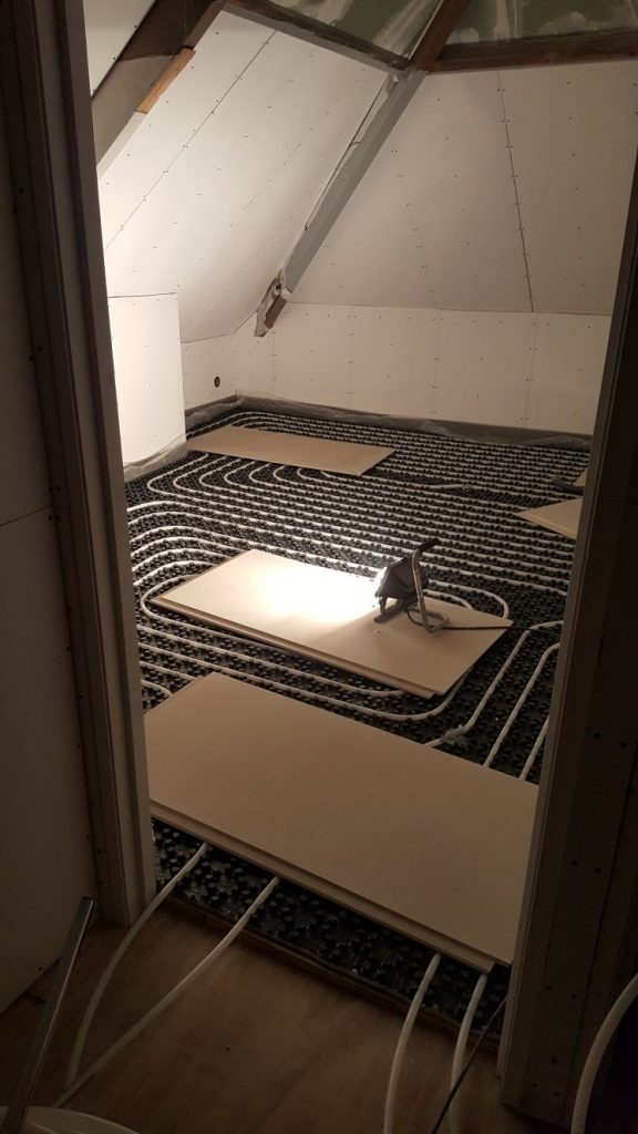 En dan kan het feest beginnen: de vloerverwarming leggen! Dit is in de kinderkamer.