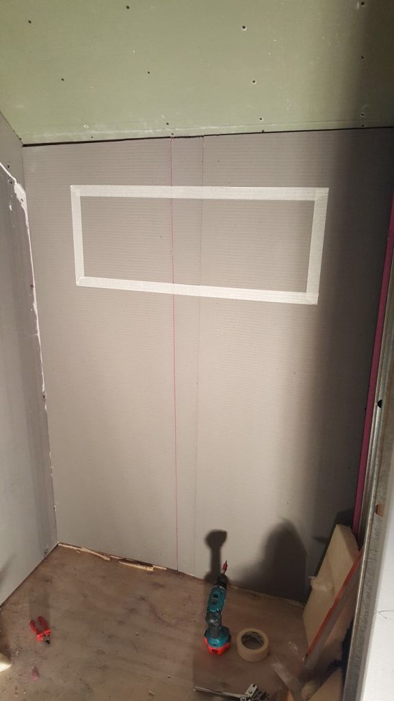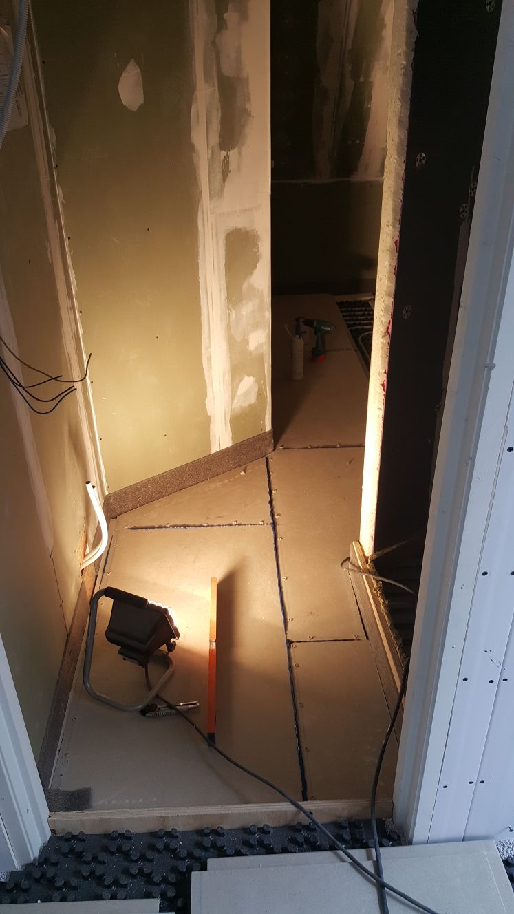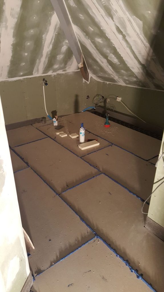 De hele badkamer is nu dicht. Als de lijm tussen de platen is weggehaald, kunnen daar in principe de tegels worden gelegd.