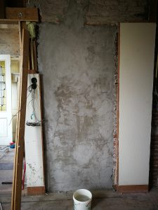 Ook de muur in de overloop op de eerste verdieping is dicht gesmeerd en zo glad mogelijk gemaakt.