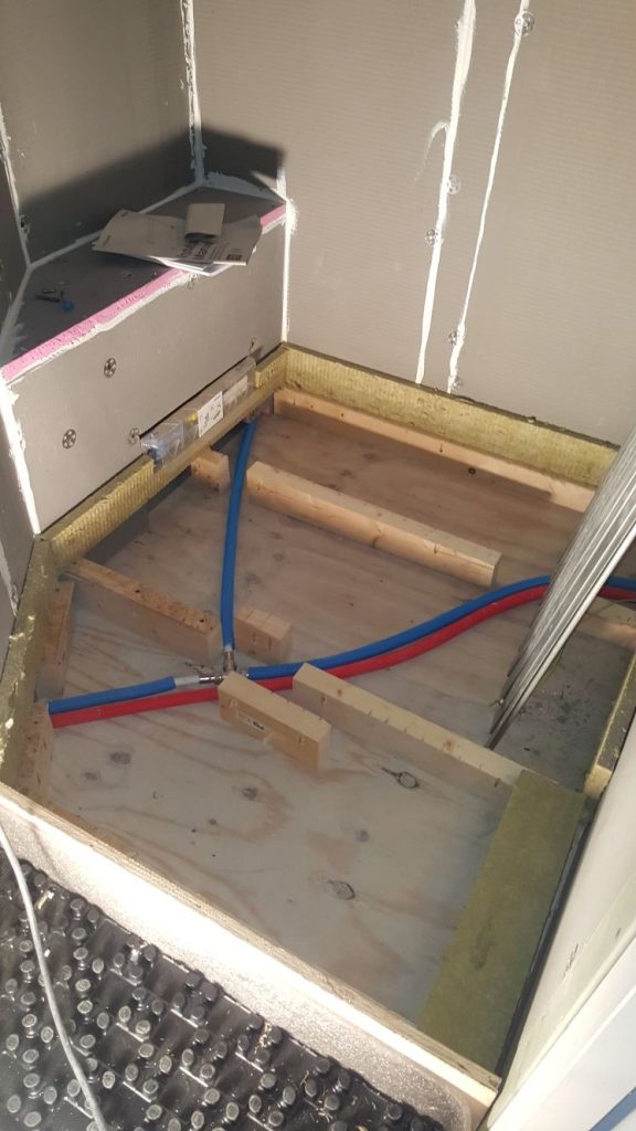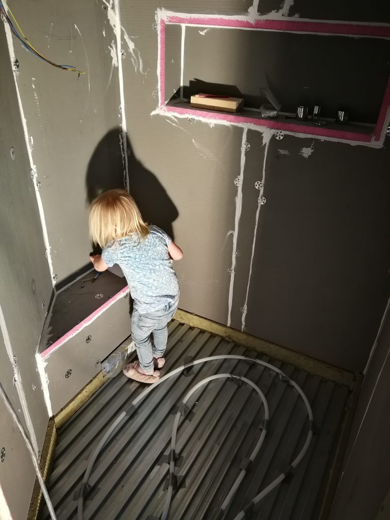 De doucheruimte mét vloerverwarming. Signe doet een laatste inspectie.