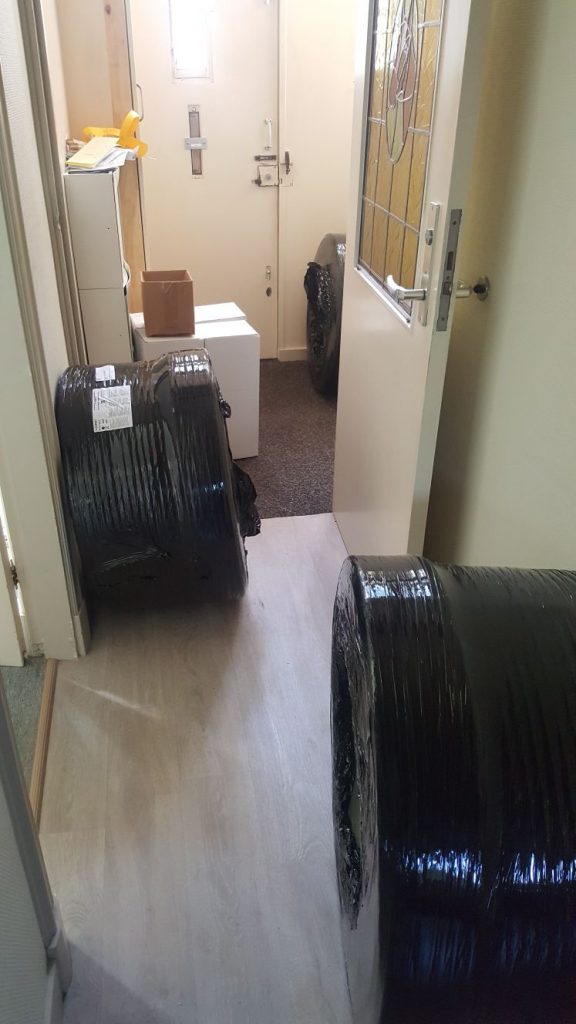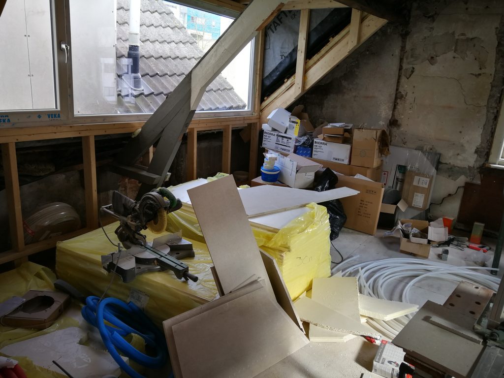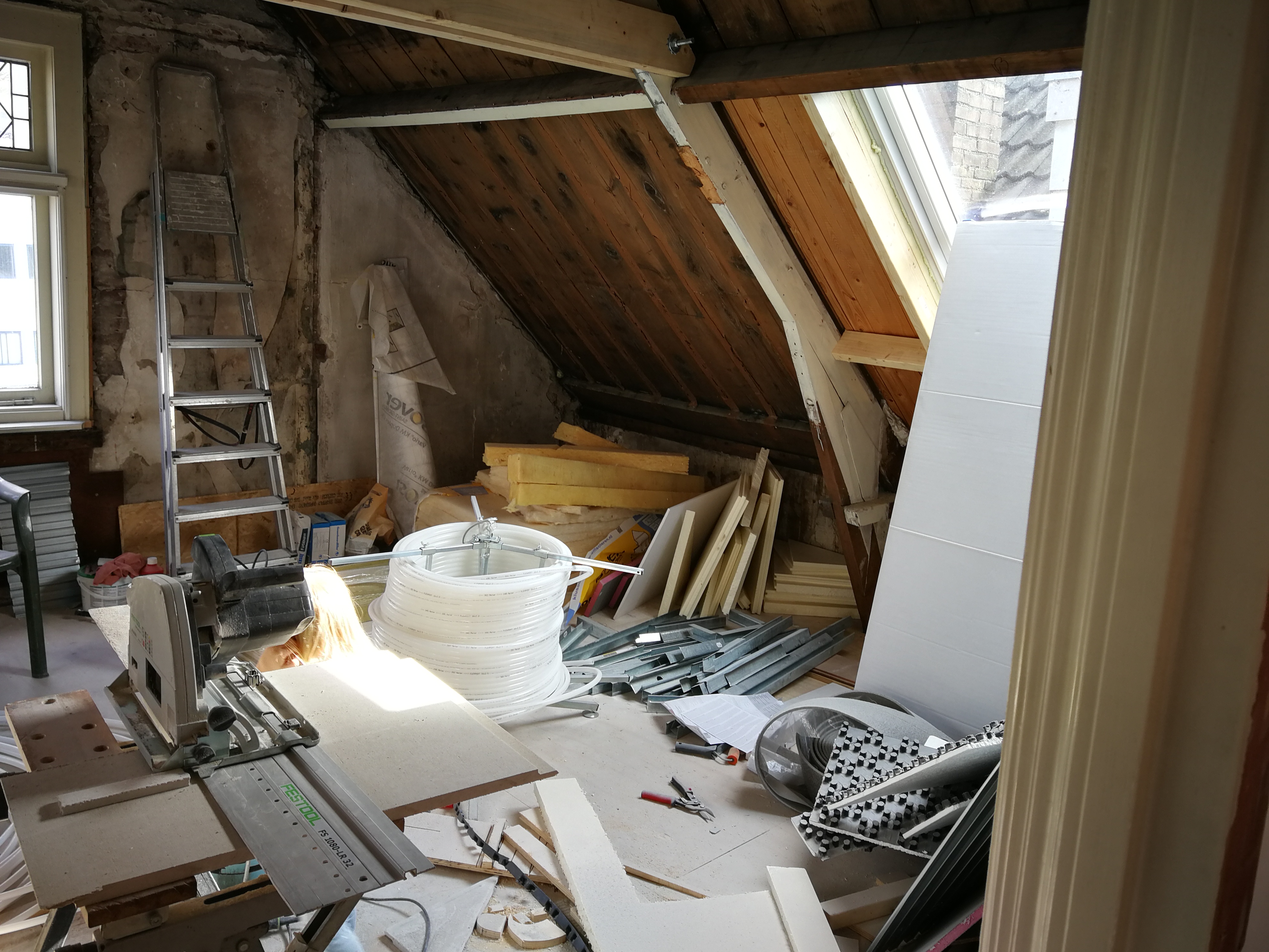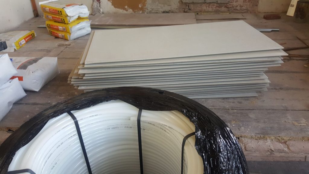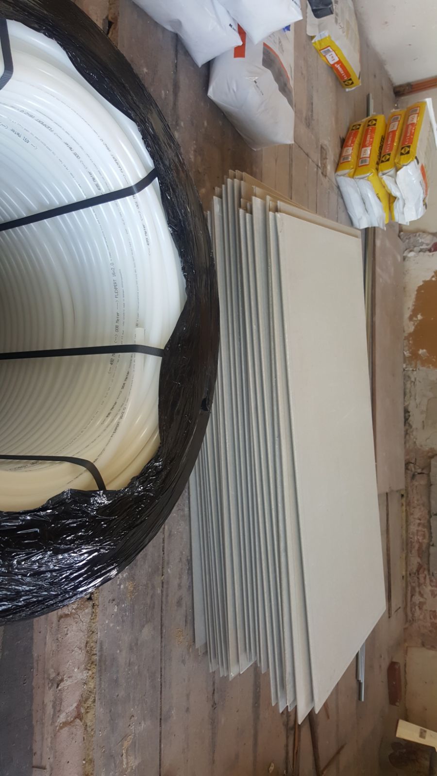 Over vloerverwarming gesproken. Na maanden was het dan zover: de reusachtige rollen werden bezorgd. Het was nog een uitdaging om die in z´n eentje naar boven te sjouwen. Daarachter liggen de vloerplaten van gips. En pakken betonmortel voor de muren.