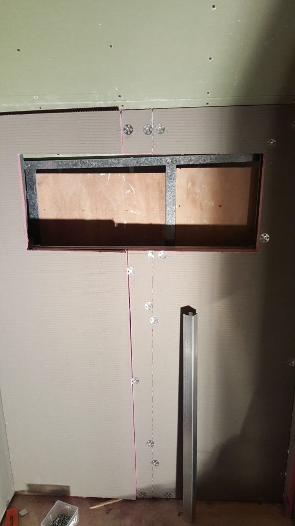 En ook in de overloop wordt alles uitgevlakt, met veel vulling, bolletjes en daarna de noppenprofielen. Ook hier maakt Steef een soort bak, omdat er opstapjes komen tussen de verschillende ruimtes.