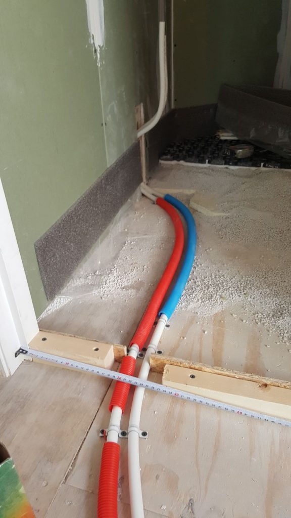 Dan eindelijk eens een meevaller. De verdelers van de vloerverwarming (het startpunt waar de leidingen samenkomen, niet op de foto), konden precies mooi boven elkaar geplaatst worden. Op zolder komt dit uiteindelijk ook in de kast bij de CV.