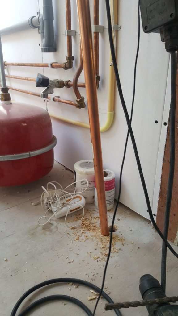 Goeie actiefoto van Steef. Hier loopt de leiding naar de verdeler op de eerste verdieping.