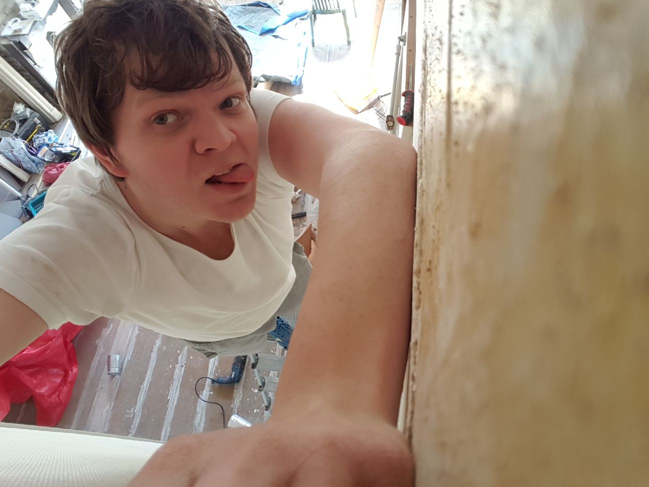 En natuurlijk in de badkamer, want die moet als eerste af! Hier zie je meteen de ijzeren profielen in de douche liggen.