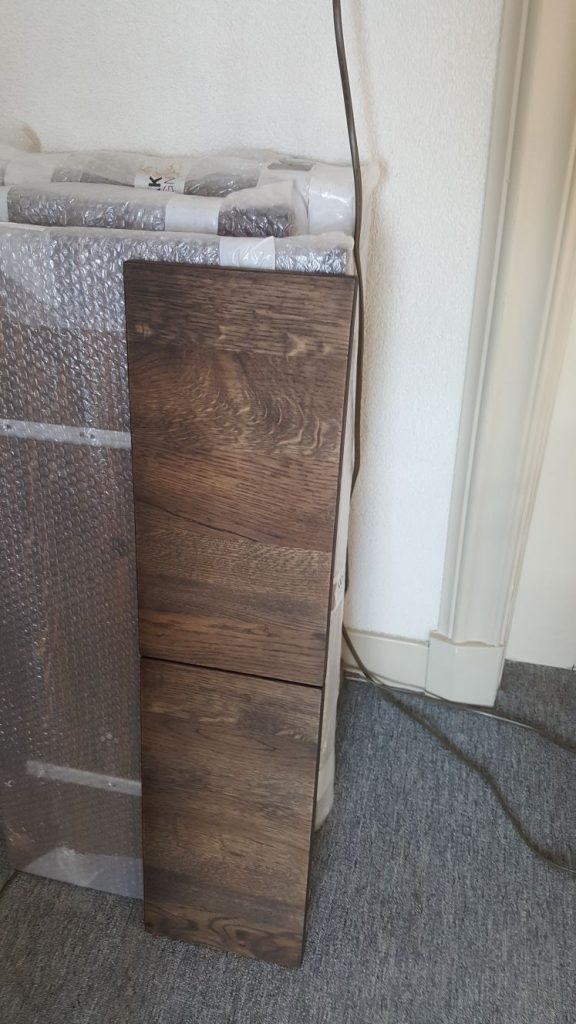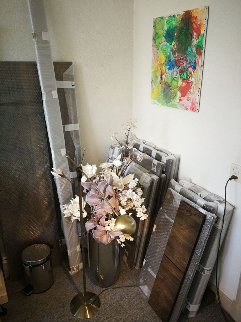 De keukenfronten! Ze staan nu gezellig bij ons in de woonkamer.